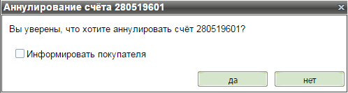 Выбор пункта «Аннулировать счет» контекстного меню вызывает открытие нового окна «Аннулирование счета» с запросом подтверждения действия. Чекбокс «Информировать покупателя» позволяет настроить отправку сообщения об аннулировании счета на электронный адрес покупателя.