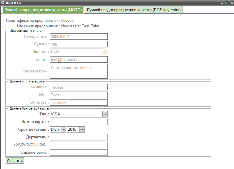 Выбор пункта «Оплатить» контекстного меню вызывает открытие нового окна «Оплатить» с двумя вкладками для ввода данных банковской карты плательщика в режимах MOTO (ввод данных карты в отсутствии клиента) и POS key entry (ввод данных карты в присутствии клиента). Далее пользователю Личного кабинета следует перейти на вкладку того типа платежа, который необходимо провести (активная вкладка выделена зеленым цветом).
