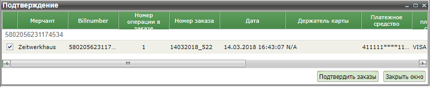 После нажатия кнопки «Подтвердить заказы» в колонке «Результат» отображается результат для каждого заказа, по которому производилось снятие денежных средств. В случае неуспеха отображается соответствующая ошибка.