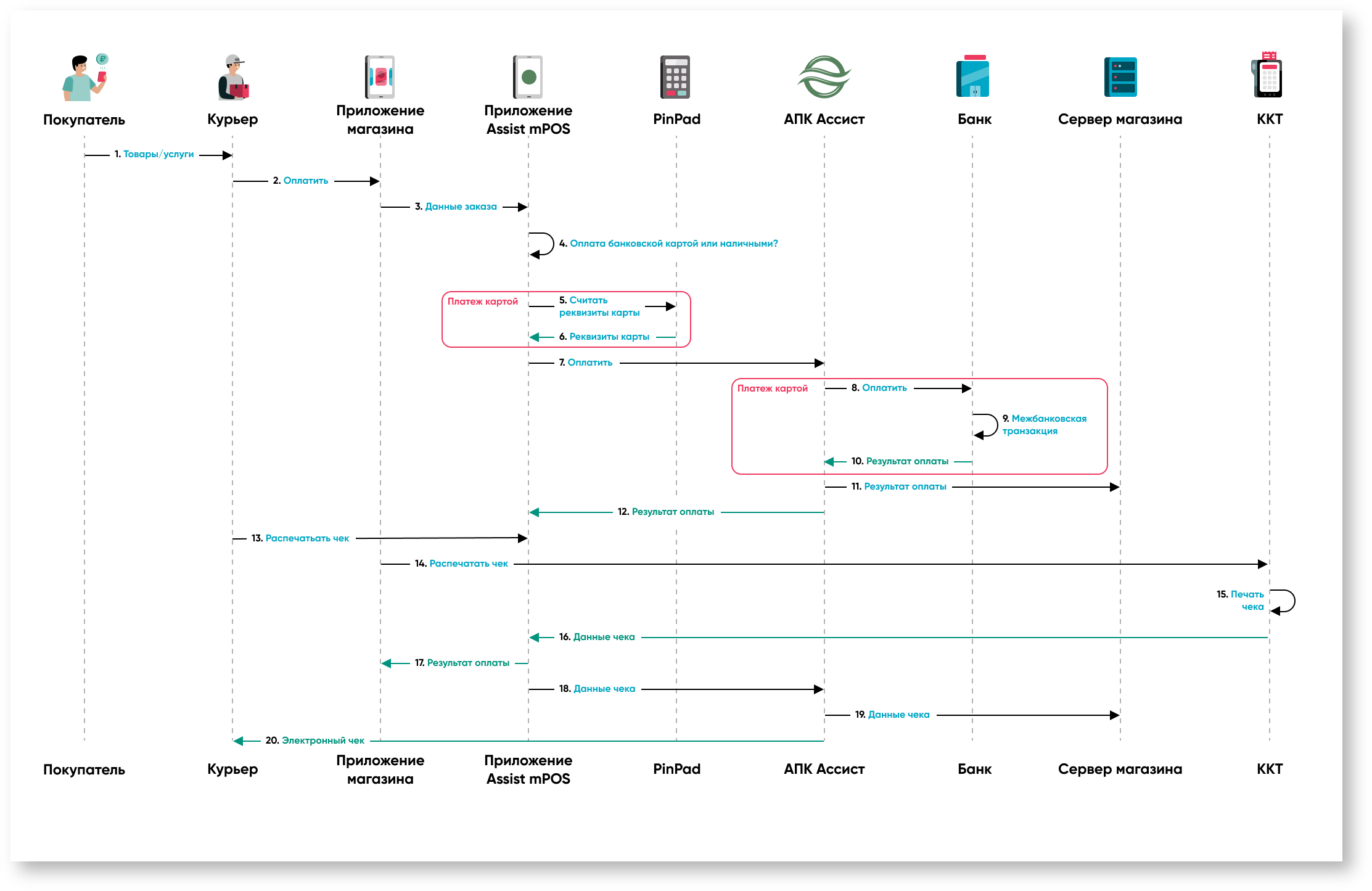 - Приложение Assist mPOS отправляет платежную информацию на сервер АПК Ассист.