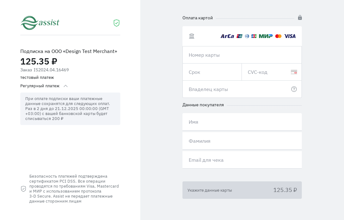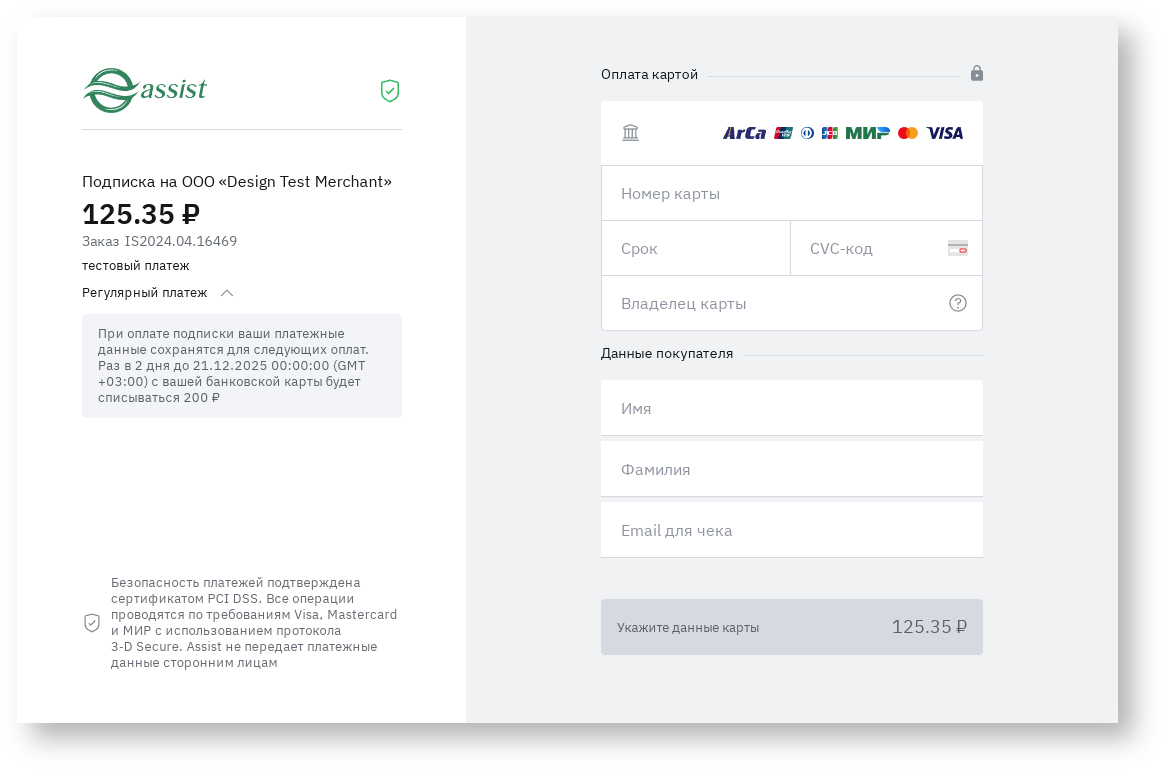 При совершении первоначального рекуррентного платежа на платежных страницах АПК Ассист покупатель увидит следующее сообщение о подписке: