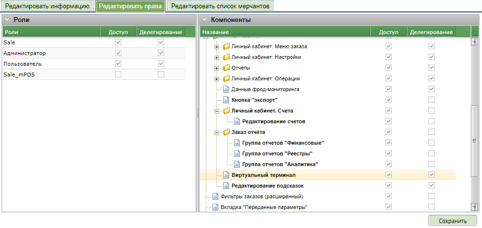 Проведение платежей через виртуальный терминал возможно только при наличии у пользователя соответствующих прав в системе. Проверить наличие необходимых прав можно следующим образом: