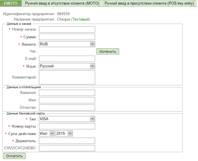 - Если имеется только один мерчант с настроенной оплатой через виртуальный терминал, то выбор мерчанта системой не предлагается, а сразу осуществляется переход к экранной форме для проведения платежа.