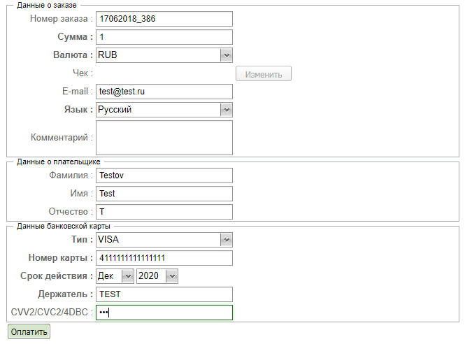 4.Теперь необходимо заполнить поля экранной формы для проведения платежа. Подтверждение внесенных данных осуществляется с помощью кнопки «Оплатить».