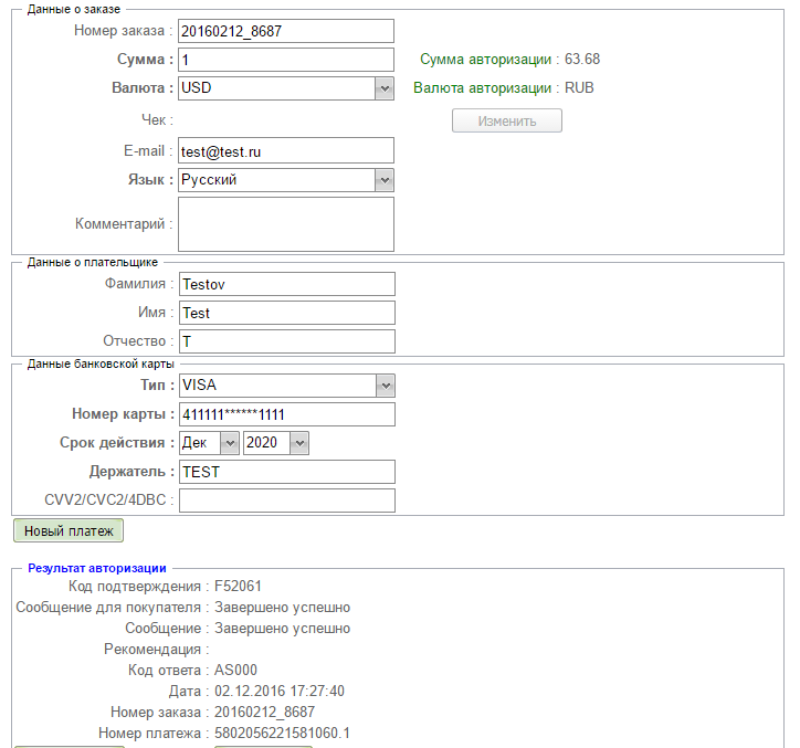 - если нужно провести платеж для того же мерчанта и такого же режима оплаты, то следует нажать на кнопку «Новый платеж», тогда все поля экранной формы очистятся и можно вносить данные нового платежа;
