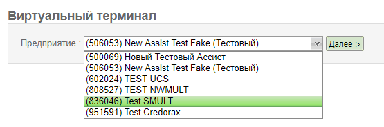 - Если имеется несколько мерчантов, у которых настроена оплата через виртуальный терминал, то система предлагает выпадающий список для выбора нужного мерчанта. Выбор мерчанта необходимо подтвердить с помощью кнопки «Далее». Если мерчант работает в тестовом режиме, то в его наименовании в скобках будет присутствовать слово «Тестовый» (без кавычек).