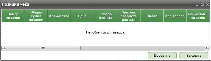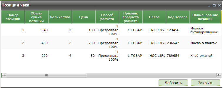 После добавления очередной позиции по заказу, все позиции будут отображаться в табличном виде в окне «Позиции чека».