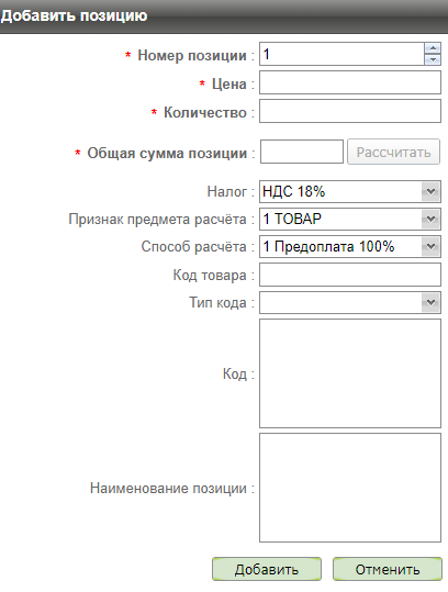После заполнения полей «Цена» и «Количество» становится активной кнопка «Рассчитать». Нажатие этой кнопки автоматически заполняет поле «Общая сумма позиции» вычисленным значением (Цена*Количество), перед расчетом также автоматически будет выполнено округление по арифметическим правилам значений в поле Цена (до двух знаков после запятой) и Количество (до трех знаков после запятой).