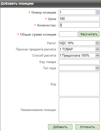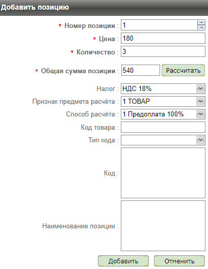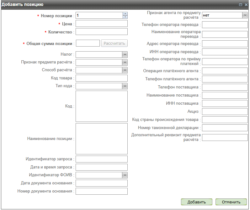 Для предприятий, которые по роду своей деятельности нуждаются в передаче дополнительных параметров позиций чека, в форме добавления позиции отображаются такие параметры.