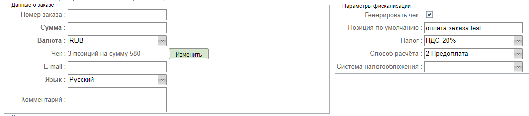 Если предприятие работает с передачей чека, то при подготовке платежа возможно указание позиций чека и их параметров. Для этого необходимо нажать кнопку «Изменить» в секции «Данные о заказе». Если кнопка «Изменить» неактивна, то предприятие не работает с чеком, для включения этой функции следует обратиться в службу поддержки Assist. После нажатия кнопки «Изменить» откроется новое окно «Позиции чека».
