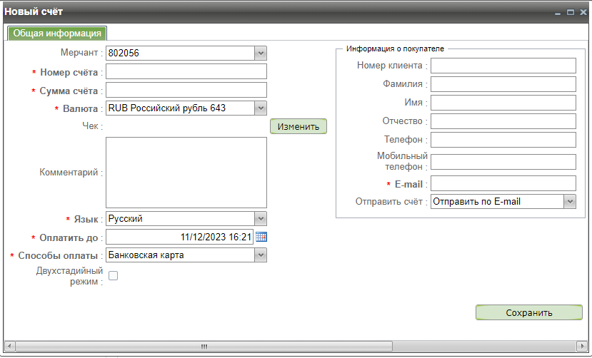Отдельная кнопка «Новый счет» позволяет оператору создать счет прямо из личного кабинета. После нажатия этой кнопки открывается новое окно для создания счета. Обязательные параметры отмечены звездочками.