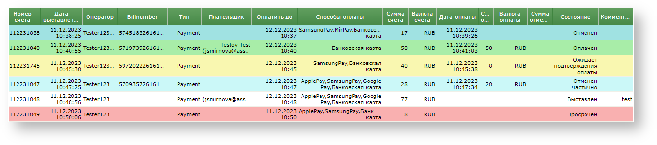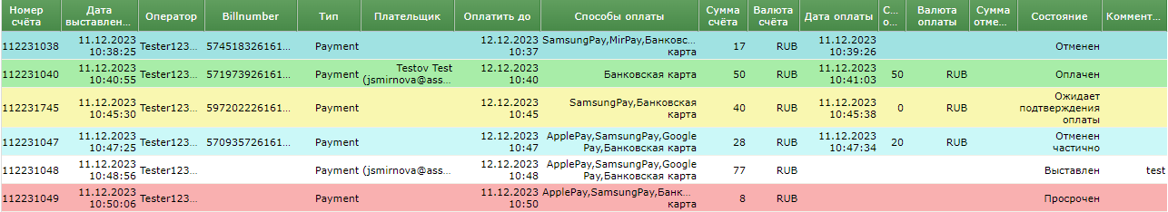 При этом таблица счетов с выделенными статусами будет иметь следующий вид: