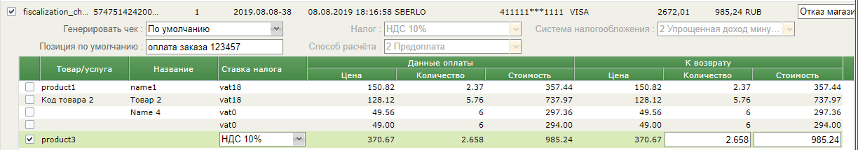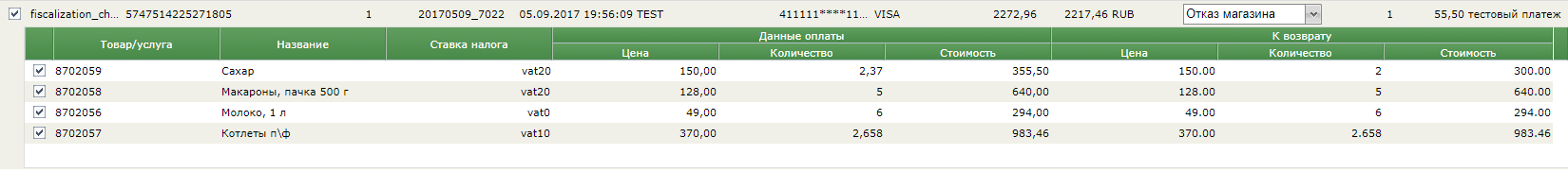 Позиции заказа с чеком в окне возврата денежных средств