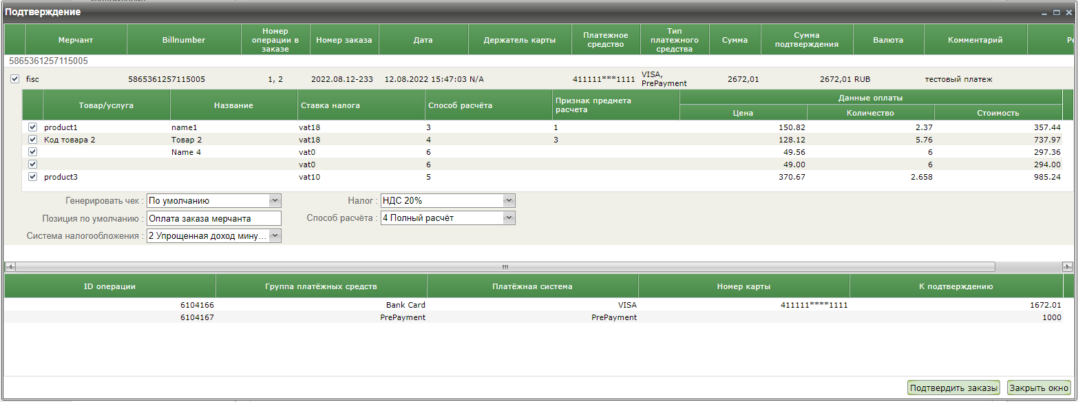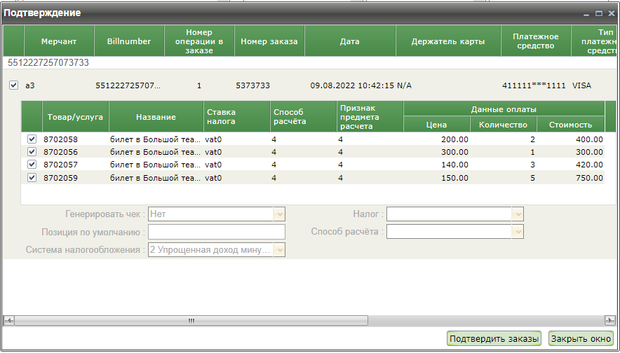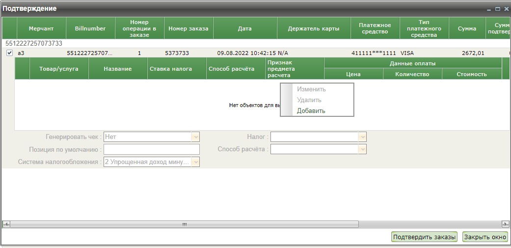 Если по заказу была выполнена предоплата, то двойной клик на таком заказе в первом блоке окна подтверждения открывает новое окно, в котором отображаются позиции заказа. Также можно добавить позиции заказа вручную, если фискализация выполняется на этапе его подтверждения.
