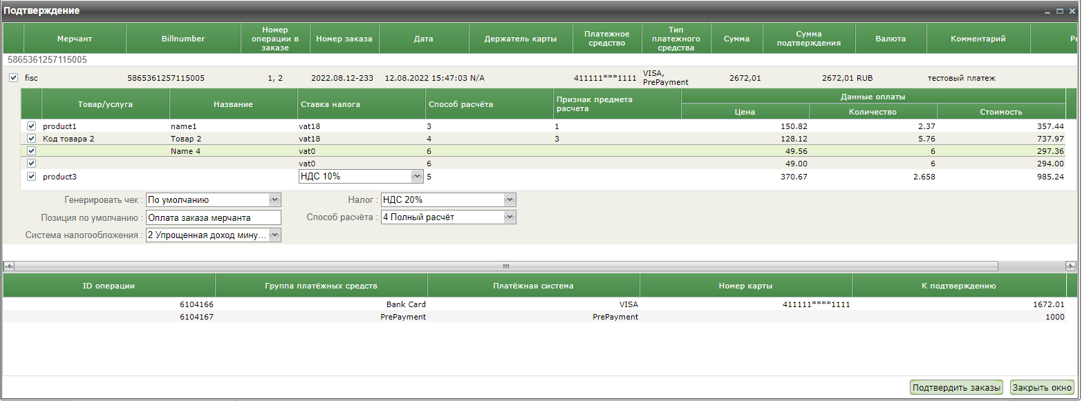 - Фискализация выполняется на этапе авторизации заказа. Все параметры фискализации должны быть переданы предприятием при оплате заказа. Если параметры не переданы, то они устанавливаются по умолчанию согласно настройкам предприятия. В окне подтверждения параметры фискализации недоступны для редактирования.