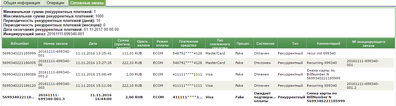 Также информация по блокировочному платежу отображается во вкладке «Связанные заказы» при детализации любого из платежей в данной подписке. Поле «Комментарий» отражает причину появления блокировочного платежа.
