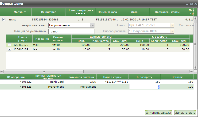 Если при создании заказа были переданы данные чека, то двойной клик на таком заказе в окне возврата денежных средств открывает новое окно, в котором отображаются позиции заказа. Отмена таких заказов осуществляется только с помощью полной или частичной отмены их позиций.
