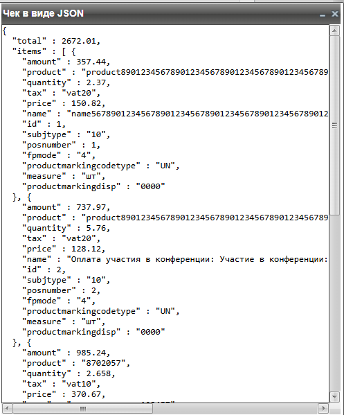 В окне списка позиций по кнопке Показать JSON можно получить текущий чек в формате JSON.