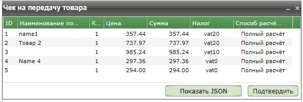 Отображение чека на передачу товара в формате JSON