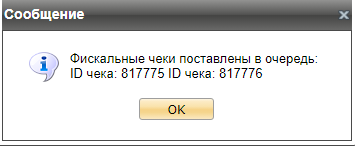 Чек на передачу товара отправляется в ОФД по кнопке Подтвердить. Если чек был разделен на несколько чеков из-за большого количества позиций (в соответствии с настроенным максимальным количеством позиций в чеке), то в окне подтверждения отображаются ID всех созданных чеков.