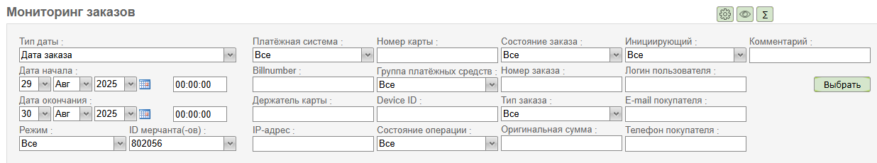 В разделе мониторинга заказов доступны для использования фильтры по следующим параметрам:
