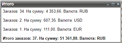 Нажатие кнопки отображает в дополнительном окне итоги по каждой валюте, в которой производилась оплата заказов с указанием количества заказов в данной валюте, а также общий итог в рублях.