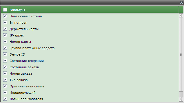 - Billnumber – внутренний номер заказа одного из предприятий (мерчантов) пользователя, по которому осуществляется поиск заказа вне зависимости от значений других фильтров. Поиск осуществляется по полному совпадению.