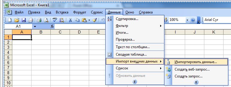 - в меню работы с данными выбрать Данные -> Импорт внешних данных -> Импортировать данные;