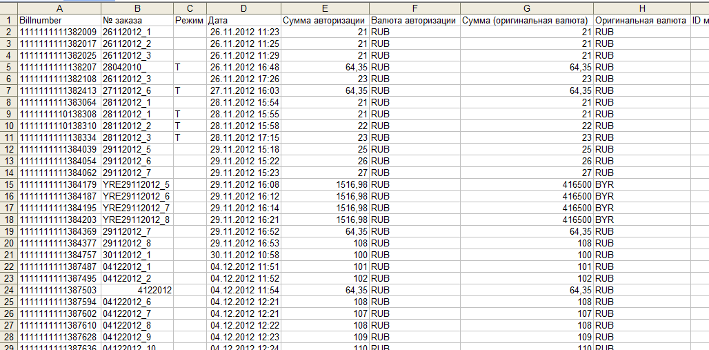 Успешный результат импорта файла (выборка по установленным фильтрам в окне мониторинга заказов) в программу MS Excel выглядит следующим образом (показан фрагмент экрана):