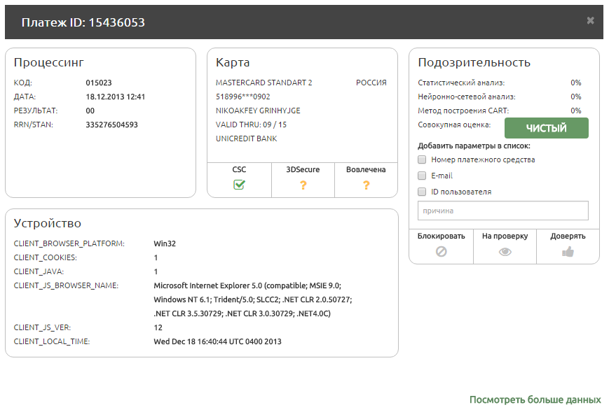 Оценки математических моделей и эксперта варьируются в диапазоне от 0 до 100%, а значение совокупной оценки платежа на мошенничество может принимать лишь три значения - 0%, 50% и 100%, что означает "чистый", "подозрительный" и «фрод» (мошеннический) платеж соответственно.