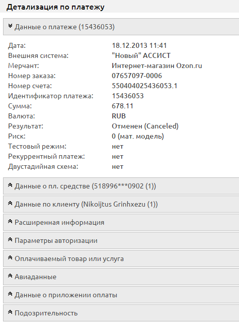 Выбор пункта «Посмотреть больше данных» открывает новое окно с расширенной информацией о платеже. Окно состоит из нескольких блоков, которые «раскрываются» по нажатию на заголовок:
