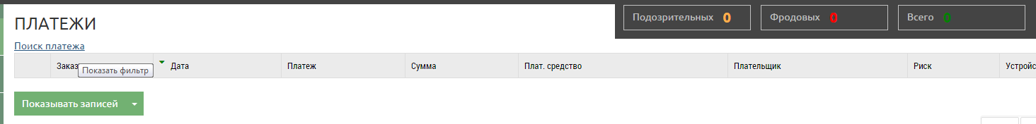 После окончания формирования выборки платежей в соответствии с поисковым фильтром, в верхней части экрана отображается информация о количестве фродовых и подозрительных платежей в полученной выборке в виде кнопок.