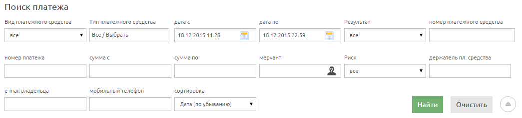 Сортировка | По умолчанию сортировка записей в таблице осуществляется в порядке убывания даты платежа. Здесь можно изменить сортировку записей в таблице путем выбора возможных вариантов из выпадающего списка: Дата (по убыванию), Сумма (по возрастанию), Сумма (по убыванию), Плат. средство действует до (по возрастанию), Плат. средство действует до (по убыванию), Риск (по возрастанию), Риск (по убыванию). |