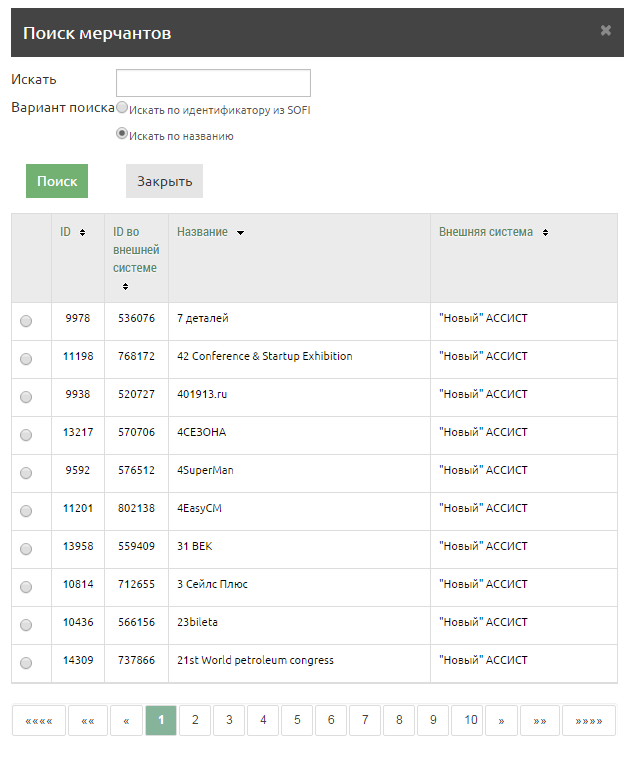 Поиск можно осуществить по идентификатору мерчанта из СПМ или по его наименованию. Наименование мерчанта можно задать с помощью маски (см. примеры ниже). Результаты поиска выводятся в таблице. Поиск ведется среди тех мерчантов, чьи платежи доступны данной учетной записи для просмотра (при условии, что у этого мерчанта были платежи в СПМ).