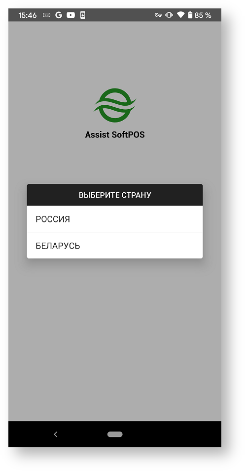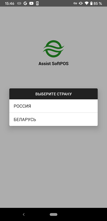 Также при первоначальном запуске приложения Assist SoftPOS необходимо выбрать страну, внутри которой будут производиться расчеты с помощью приложения.