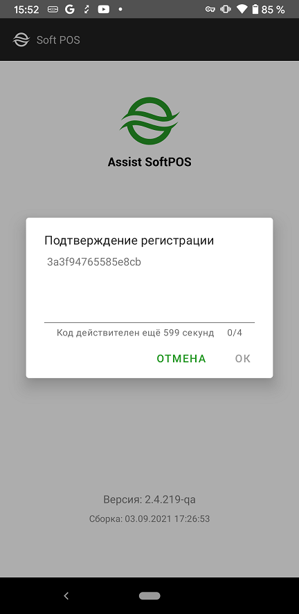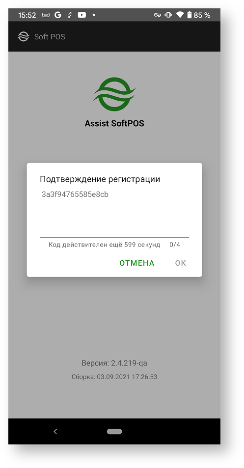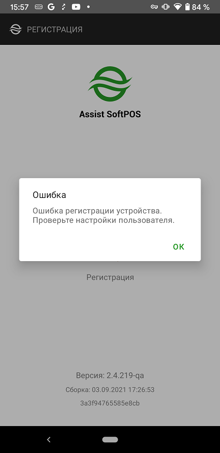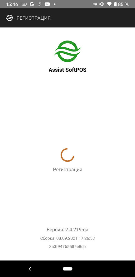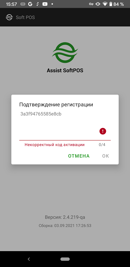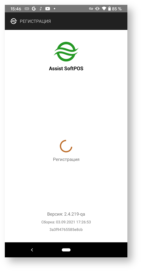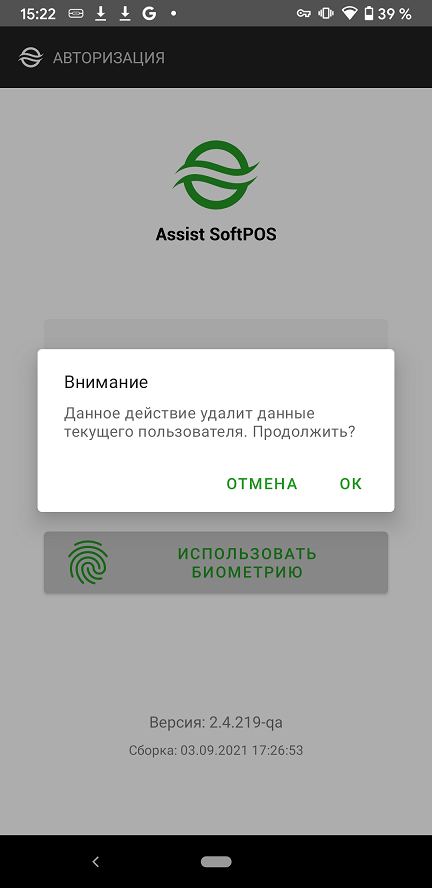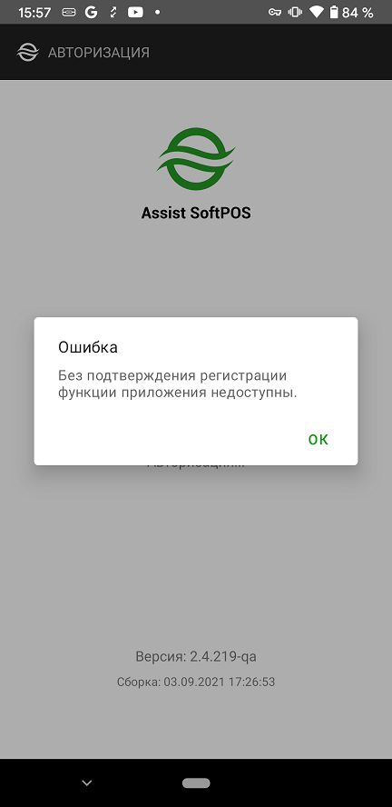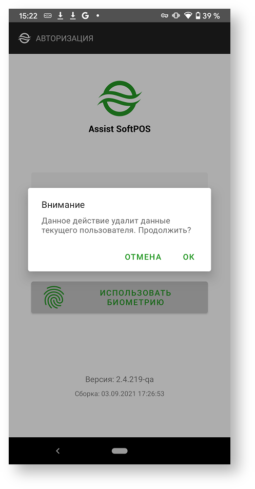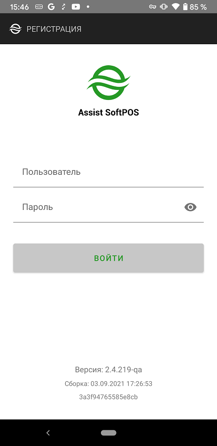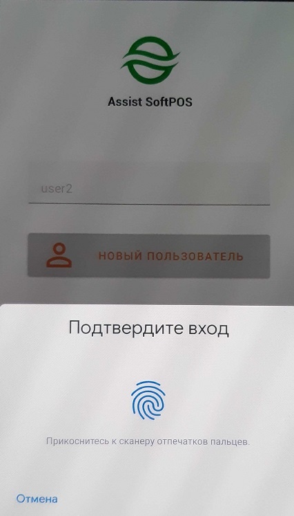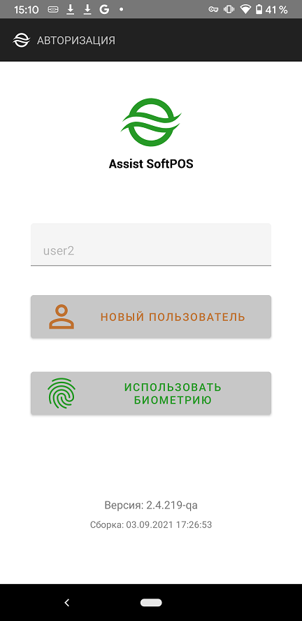 При первоначальном запуске приложения Assist SoftPOS необходимо зарегистрировать нового пользователя приложения. Для этого используются наименование учетной записи пользователя и пароль, выданные администратором системы.