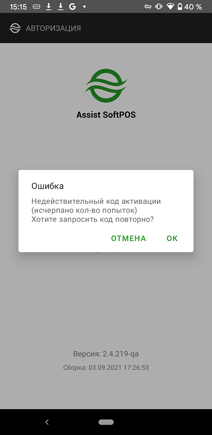 Если все три возможные попытки ввода кода (одноразового пароля) использованы неудачно, то отобразится следующее сообщение: