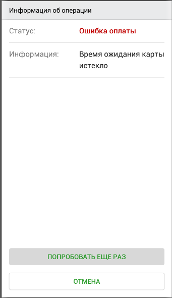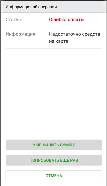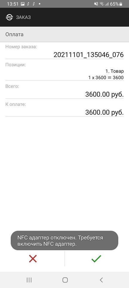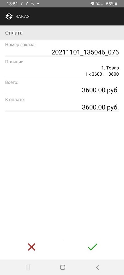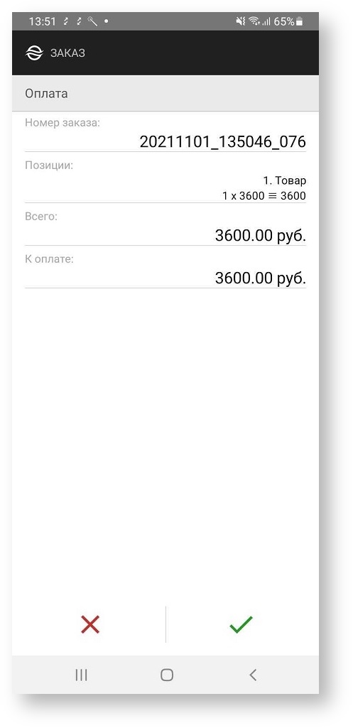 Выбор кнопки «Χ» означает отказ от оплаты, выбор кнопки «» запускает процесс оплаты заказа.