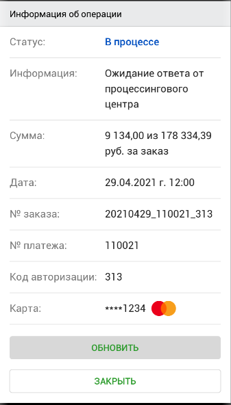 Если проведенный платеж имеет статус «В процессе», можно повторно запросить результат платежа с помощью кнопки «Обновить»: