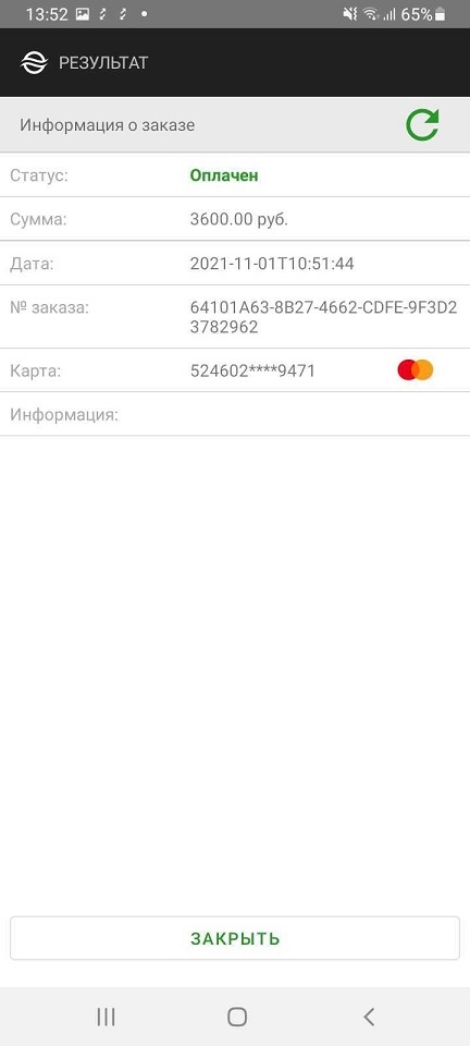 После нажатия кнопки «Закрыть» осуществляется возврат в приложение Assist mPOS.