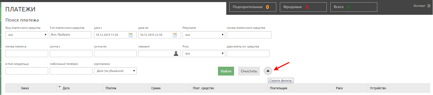 После окончания формирования выборки платежей в соответствии с поисковым фильтром, в верхней части экрана отображается информация о количестве фродовых и подозрительных платежей в полученной выборке в виде кнопок.